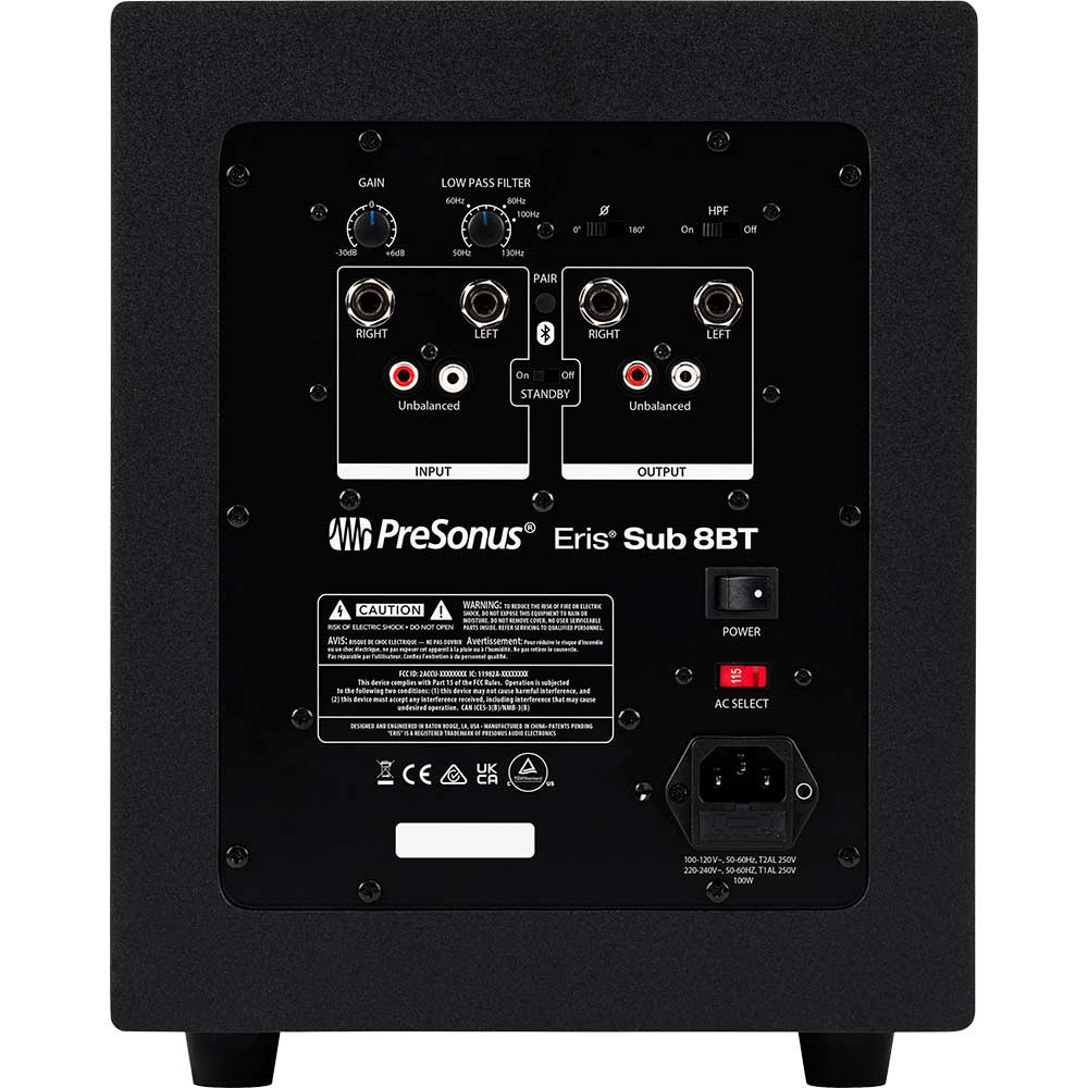 The first PreSonus studio subwoofer to offer Bluetooth® 5.0 wireless connectivity, the Eris Sub 8BT provides flexible wired connection options, as well, making it easy to add it to just about any monitoring setup. Onboard controls let you effortlessly create a 2.1 monitoring system and tune it to your room. Highpass filter and lowpass filter (crossover) controls ensure the Eris Sub 8BT starts working at the precise frequency where your main monitors stop, avoiding the flabby, smudged, low-end mess that occurs without a crossover.